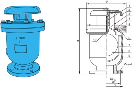 當水進入管道時,塞頭停在定浮球上部,進行大量排氣,當空氣排完時,水入閥內把球浮起,傳動塞頭到關閉,停止排氣。管道在正常運轉時自然會產生少量氣體,這些氣體全聚集到管道上部,到相當程度,閥內水位下降,浮球順水下降氣體從小孔排出。如出現(xiàn)停電、停泵,管內水流空時隨時會出現(xiàn)負壓,浮球順水下降,打開小孔帶動大孔進行大量進氣確保管道安全。