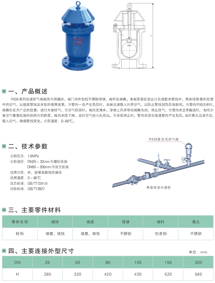 KP快速排氣閥一般壓力PN10-40/1.0-6.4MPa,150Lb-300Lb/2.0-5.0MPa,口徑為DN25-350mm,適用介質(zhì)為清水,適用于城建,自來水廠,供暖系統(tǒng),水利,等管路上,一般都是采用法蘭連接方式,適用于工業(yè)介質(zhì)為水的管路上,作為瑞奇排氣閥排除管道內(nèi)氣體的設(shè)備,以提高輸送水設(shè)備的效率和保護管道不致變形破裂,是管道的必備之設(shè)備。閥為圓桶狀式閥體,共內(nèi)部主要有不銹鋼浮球及塞頭。 本閥裝設(shè)于泵埔出口處或送配水管線中,用以大量排除管道中的集結(jié)之空氣,以增進水管及抽水機使用效率,且與管內(nèi)一旦出現(xiàn)負壓時,此閥能迅速吸入空氣,以保管線因負壓所產(chǎn)生損壞。 KP排氣閥工作原理: KP快速排氣閥利用了水對浮球的慣性自動開啟/關(guān)閉排氣口。說得具體一些就是:利用水對不銹鋼浮球的浮力的向上作用特性原理,當(dāng)水位在閥內(nèi)上升,在排氣的同時,浮球受到水的浮力作用,不銹鋼球自動上浮,直到浮止與排氣口的密封面接,水泵給壓到一定壓力時球會自動關(guān)閉,當(dāng)閥內(nèi)水位降低時,不銹鋼球會隨水位下降而下降,這時就會通過排氣口向管道注入大量空氣,裝在管道上后,當(dāng)管道在運轉(zhuǎn)時,浮球停在球碗底部,進行大量排氣,當(dāng)管內(nèi)空氣排完,水沖進閥內(nèi),經(jīng)過球碗然后反應(yīng)浮球,使浮球浮動關(guān)閉,管道在正常運轉(zhuǎn)時,如有少量氣體會集中到閥內(nèi)到相當(dāng)程度,閥內(nèi)水位下降,浮球隨之下降,氣體從小孔排出。如水泵停止,隨時會產(chǎn)生負壓力,浮球隨時下降,進行大量吸氣確保管路安全。 適用范圍 瑞奇KP快速排氣閥應(yīng)用于獨立采暖系統(tǒng)、集中供熱系統(tǒng)、采暖鍋 爐、中央空調(diào)、地板采暖及太陽能采暖,城市給水系統(tǒng)等管道排氣。因為水中通常都溶有一定的空氣,而且空氣的溶解度隨著溫度的升高而減少,這樣水在循環(huán)的過程中氣體逐漸從水中分離出來,并逐漸聚在一起形成大的氣泡甚至氣柱,因為有水的補充,所以經(jīng)常有氣體產(chǎn)生。為此就延生出排氣閥這一名詞,在日常生活也解決了不少問題。